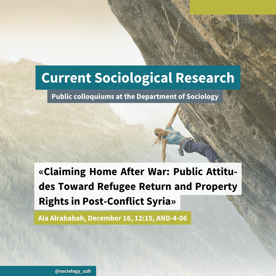 💡 Public talks at SUZ: Ala Alrababah on «Claiming Home After War: Public Attitudes Toward Refugee Return and Property Rights in Post-Conflict Syria.»