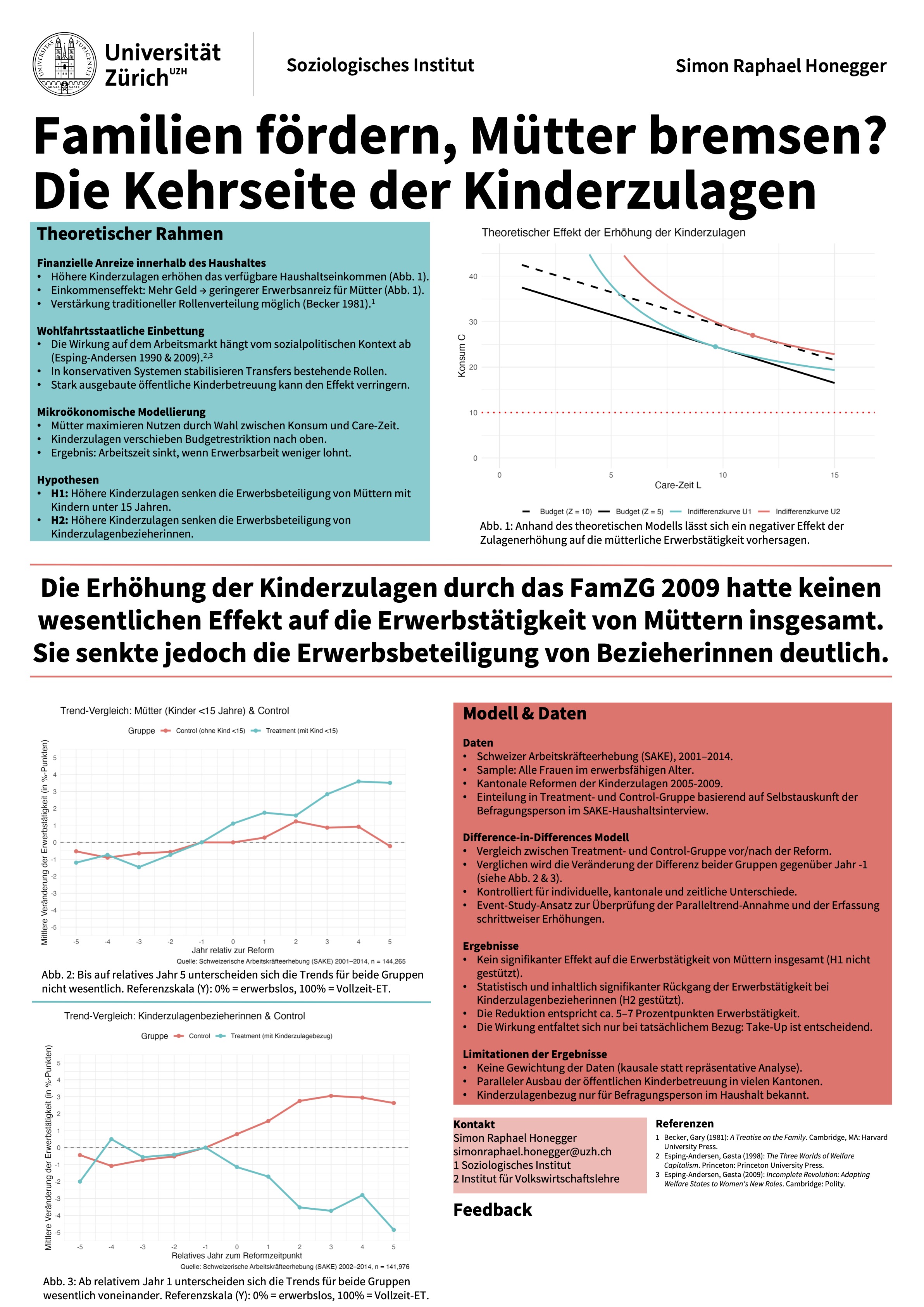 Für seine Bachelorarbeit «Familien fördern, Mütter bremsen? Die Kehrseite der Kinderzulagen» erhält Simon Raphael Honegger den UZH Semesterpreis. Seine von Marco Giesselmann betreute Arbeit analysiert die unbeabsichtigten arbeitsmarktbezogenen Effekte der Einführung des Familienzulagengesetzes (FamZG) 2009 auf die Erwerbstätigkeit von Müttern. Gratulation Simon!