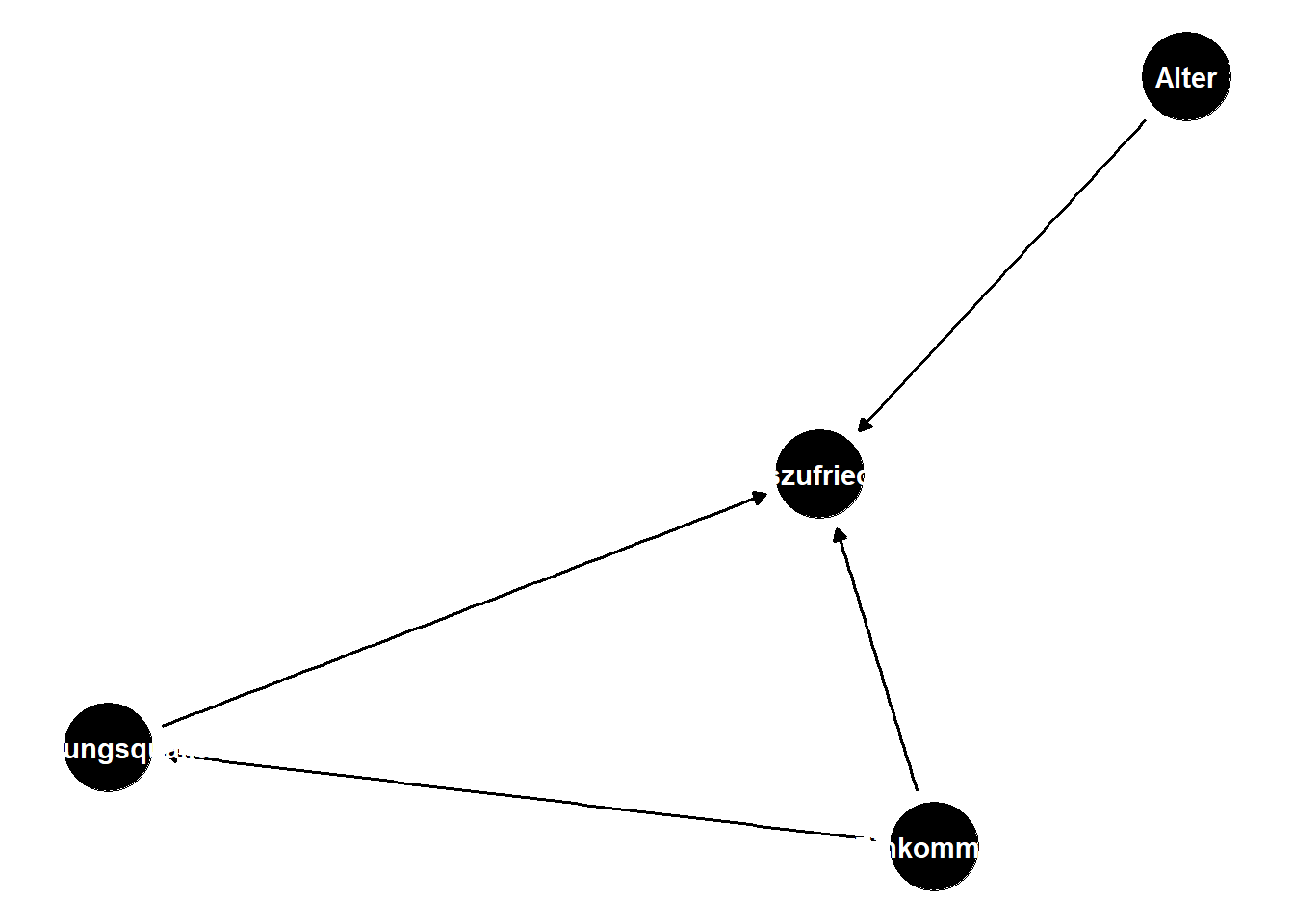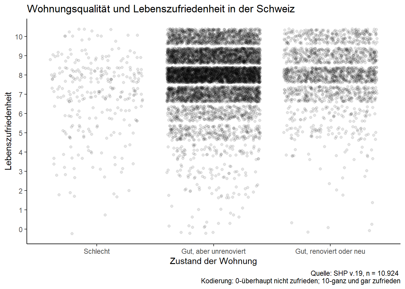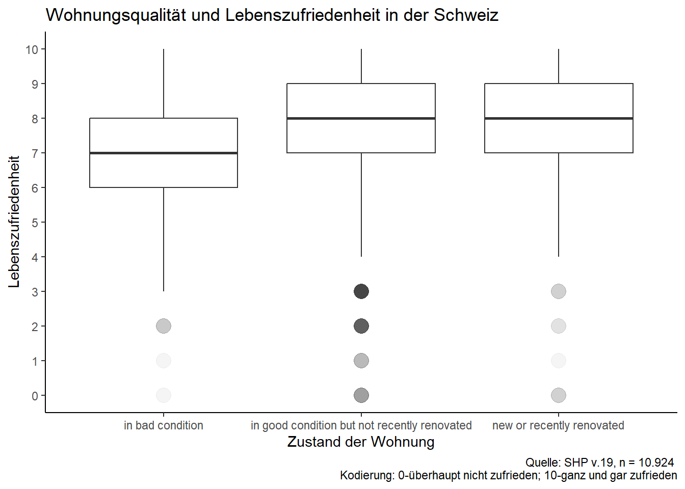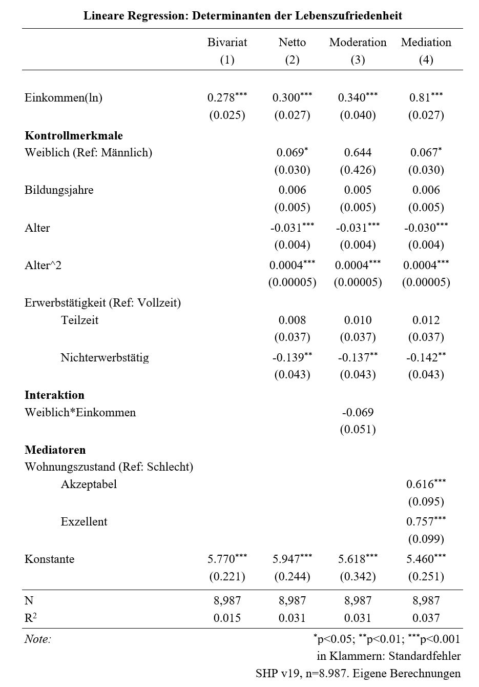 Im querschnittlichen Ansatz erfolgt die empirische Effektabsicherung bei Umfragedaten ausschliesslich über die Integration von Kontrollvariablen. Daher werden in der Analyse zusätzlich das Geschlecht, der Erwerbsstatus, Bildung sowie das Alter berücksichtigt. Das Geschlecht wird zudem als Moderator des Einkommenseffektes modelliert, da unser (in diesem Skript nicht weiter erläutertes) theoretisches Erklärungsmodell unterschiedliche Wirkungsmechanismen für Männer und Frauen etabliert hat. Neben dem bivariaten und dem bereinigten Regressionsmodell wird daher ein Moderationsmodell spezifiziert. Zudem sei angenommen, dass im Rahmen der theoretischen Auseinandersetzung die Wohnungsqualität als wichtige einkommensgebunden Ursache für subjektives Wohlbefinden identifiziert wurde; daher sollen die statistischen Mediationseigenschaften dieser Variable in einem Mediationsmodell empirisch erschlossen werden.