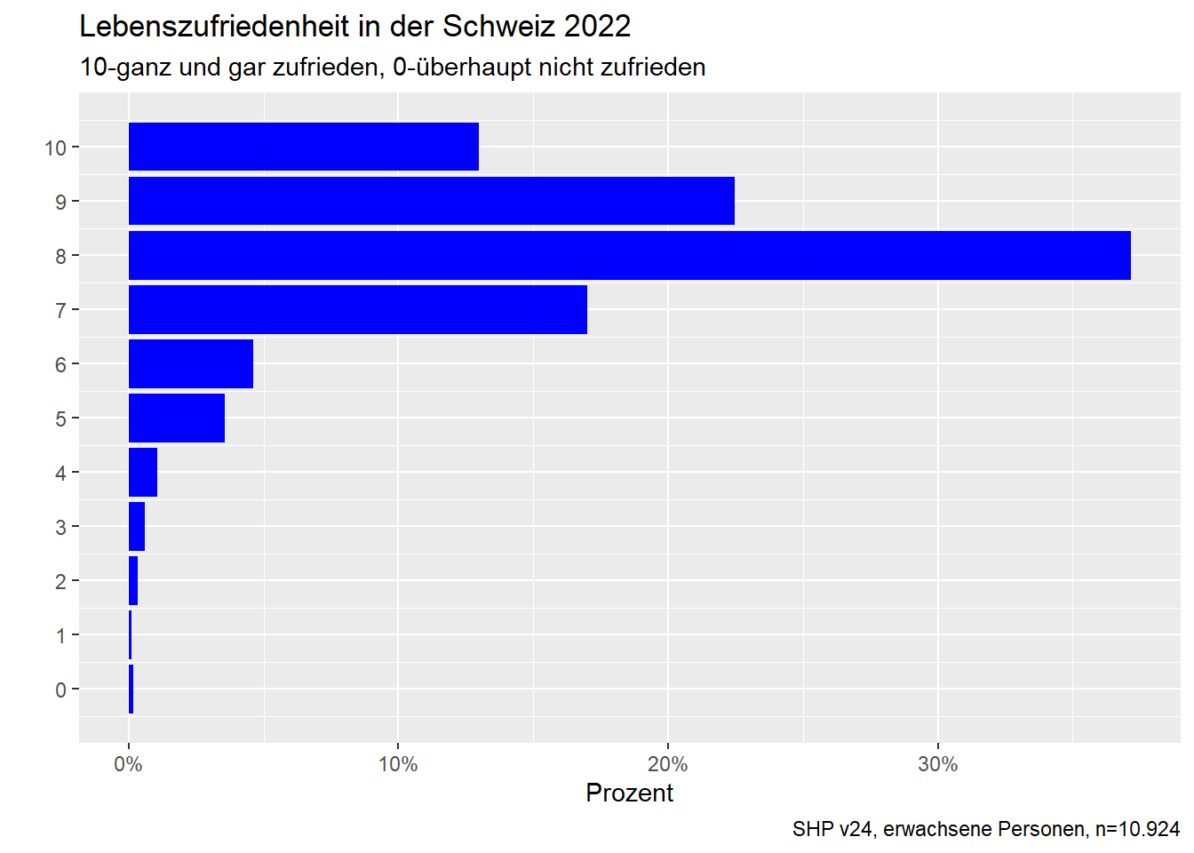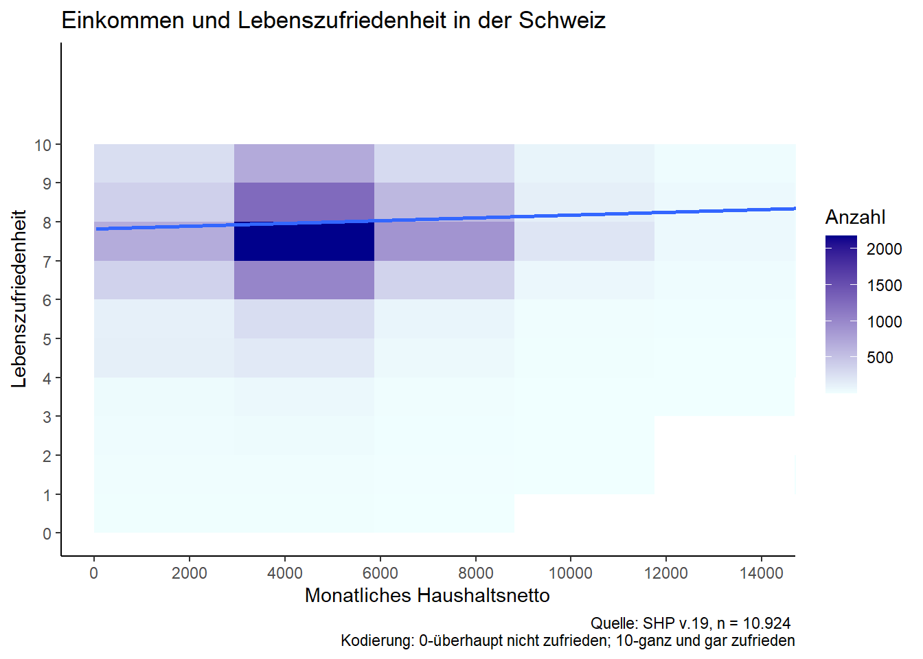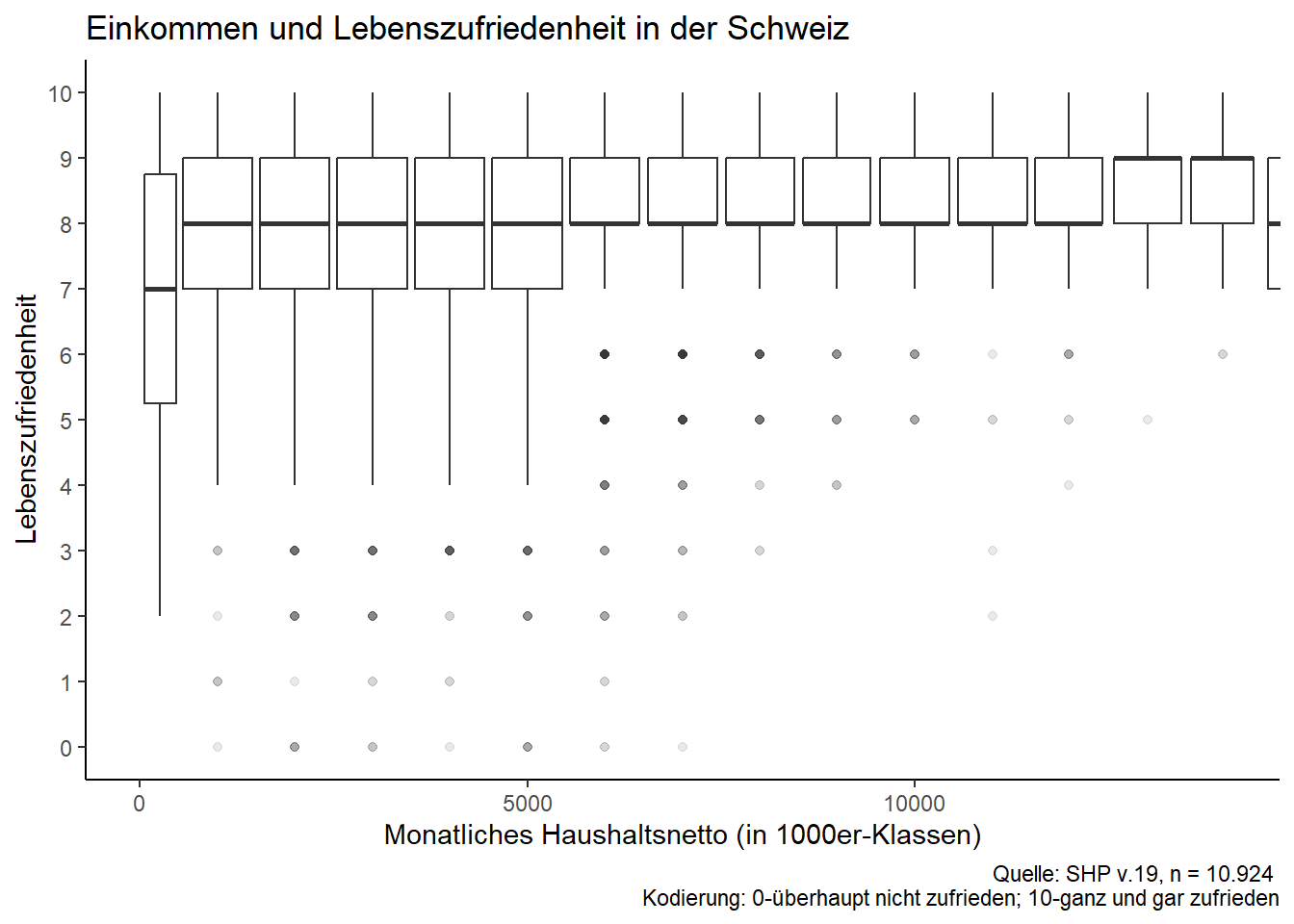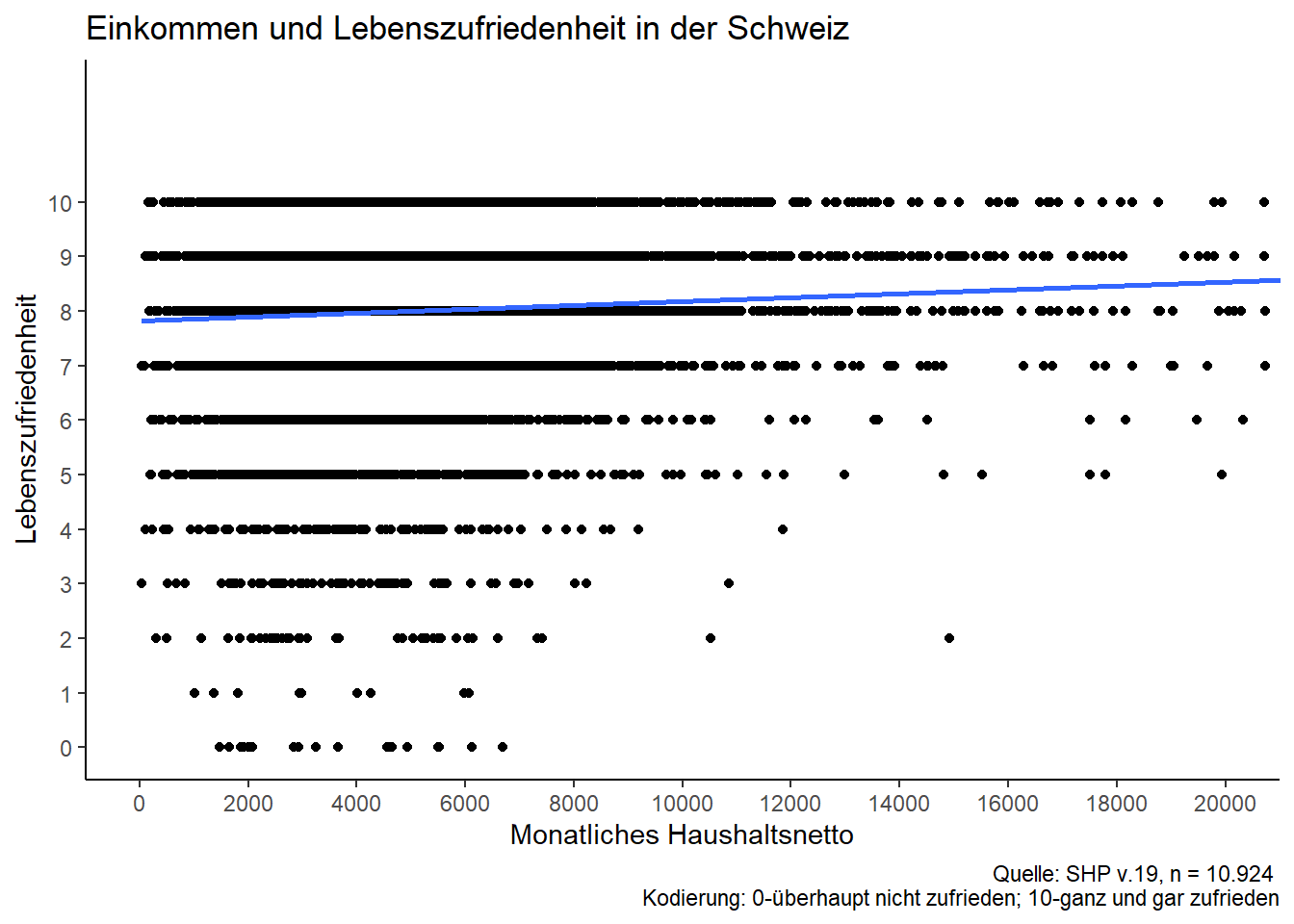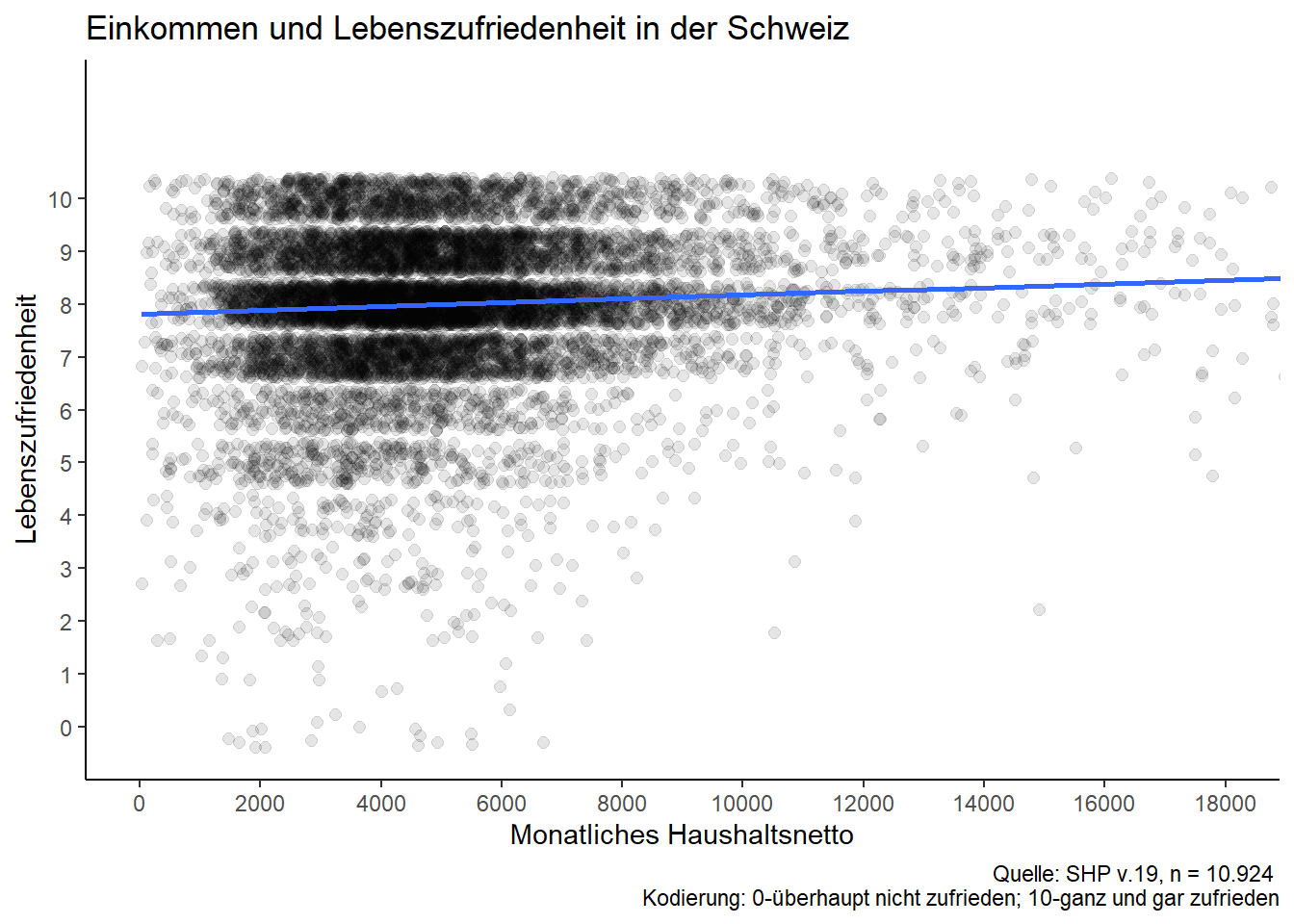 Beispielhaft untersucht wird der Effekt des Haushaltseinkommens auf die Lebenszufriedenheit auf Basis des SHP. Das Haushaltseinkommen dient dabei als Indikator für individuellen Wohlstand und wird dementsprechend als OECD-gewichtetes Haushaltsnetto (auf Monatsbasis) gemessen. Die Messung der Lebenszufriedenheit erfolgt auf einer typischen 11er Likert-Skala. Die Analyse ist querschnittlich ausgerichtet, obgleich Fragestellung & Variationseigenschaften eine längsschnittliche Analyseperspektive eröffnen - auf die das SHP grundsätzlich auch ausgerichtet ist.
