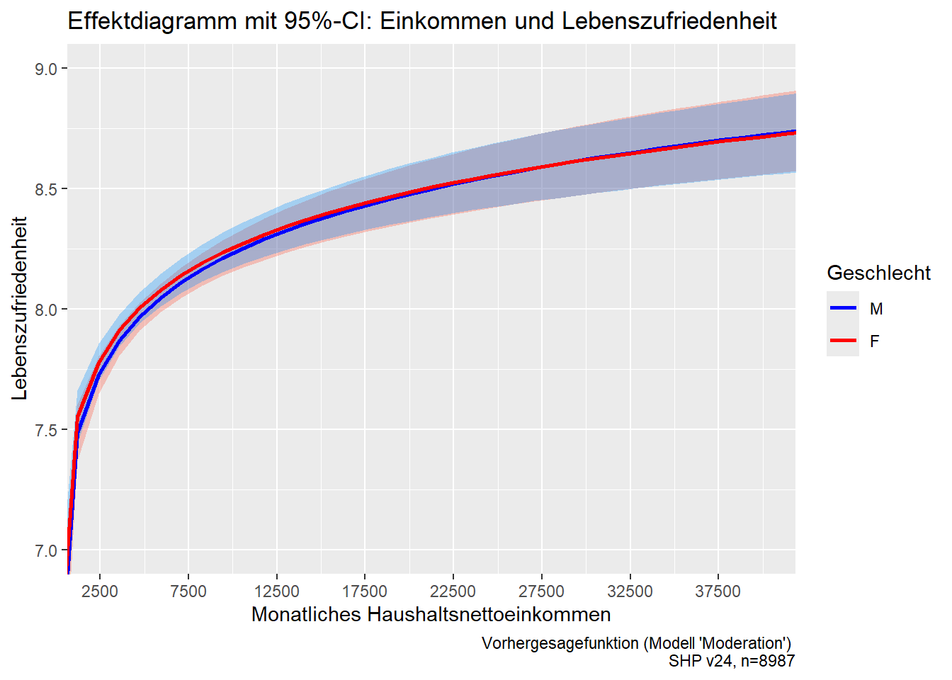 … deutlich wird der geschlechtsspezifisch unterschiedlich starke Einkommenseffekt, gleichzeitig aber auch die inhaltliche und statistische Insignifikanz dieser Unterschiede. Der Bildausschnitt wurde hier so gewählt, dass die Kreuzung der Vorhersagefunktionen einigermassen gut sichtbar wird. Die Modifikation der Legende ist herausfordernd und eine Schwäche des Packages, die hier integrierte Lösung mit scale_color_manual() sollte meistens funktionieren.