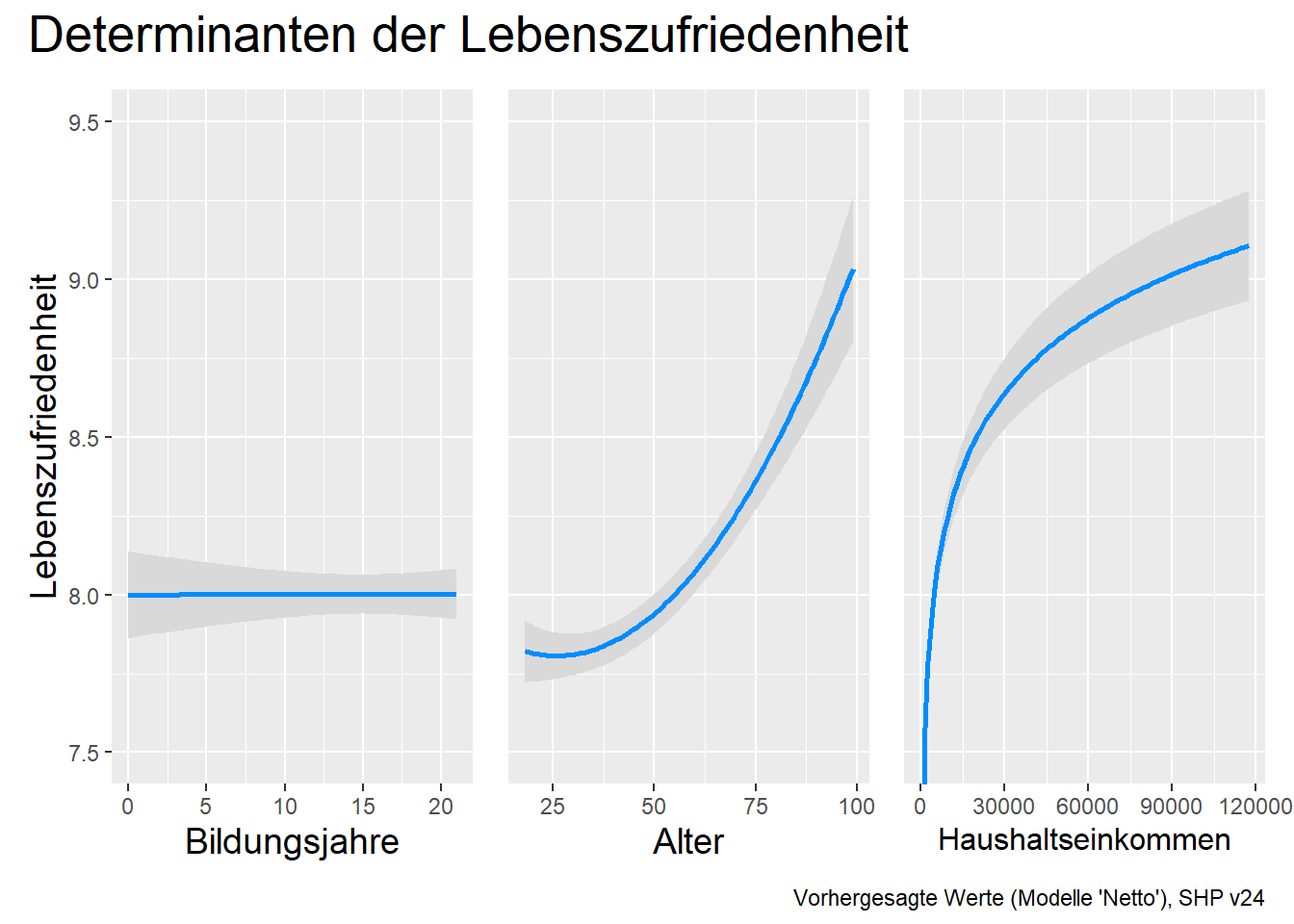 patchwork + plot_annotation(title ="Determinanten der Lebenszufriedenheit", caption="Vorhergesagte Werte (Modelle 'Netto'), SHP v24") &