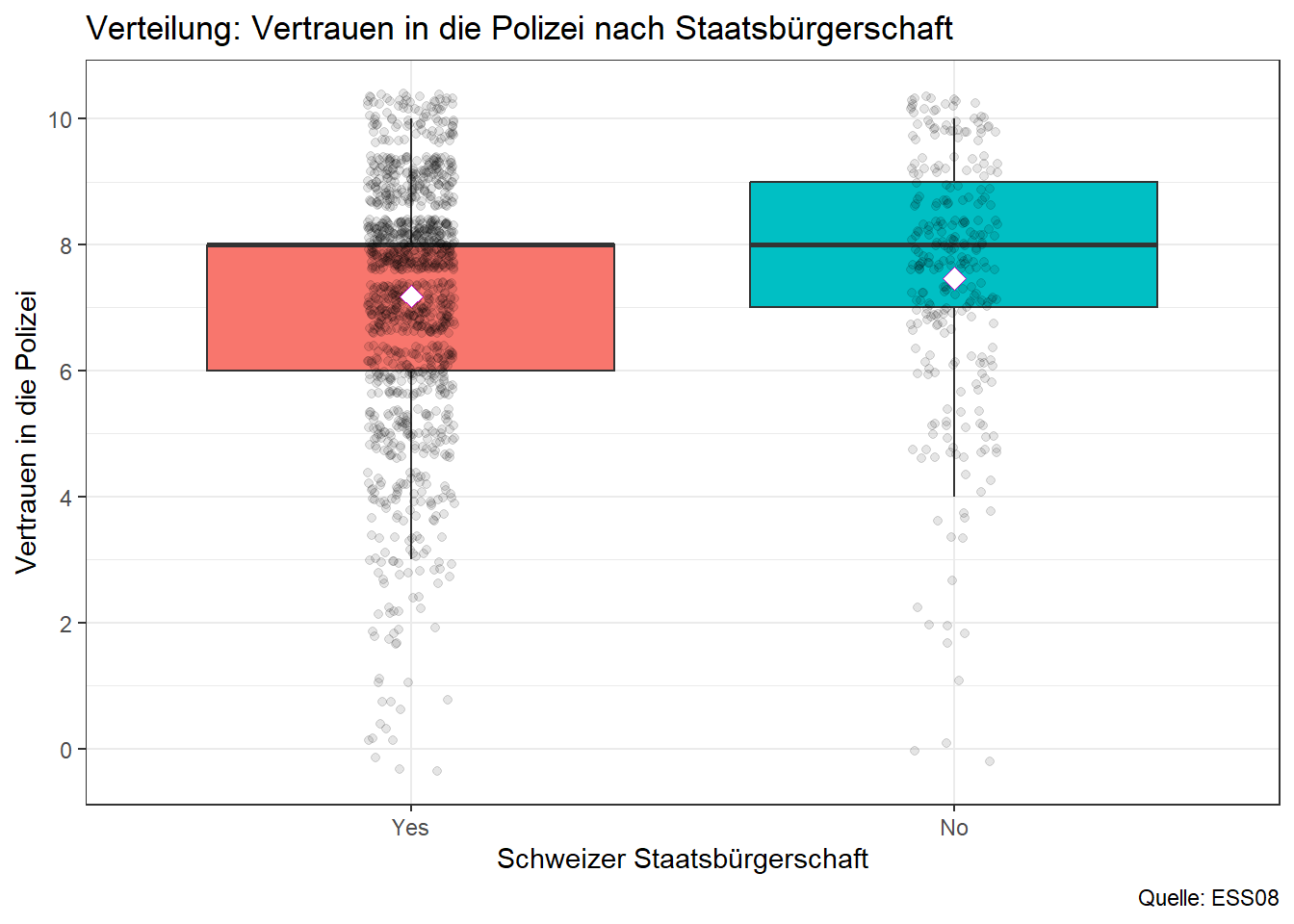 Die Nullhypothese, dass es in der Population keinen Unterschied im Vertrauen in die Polizei zwischen Personen mit und ohne Schweizer Staatsbürgerschaft gibt, kann also abgelehnt werden.