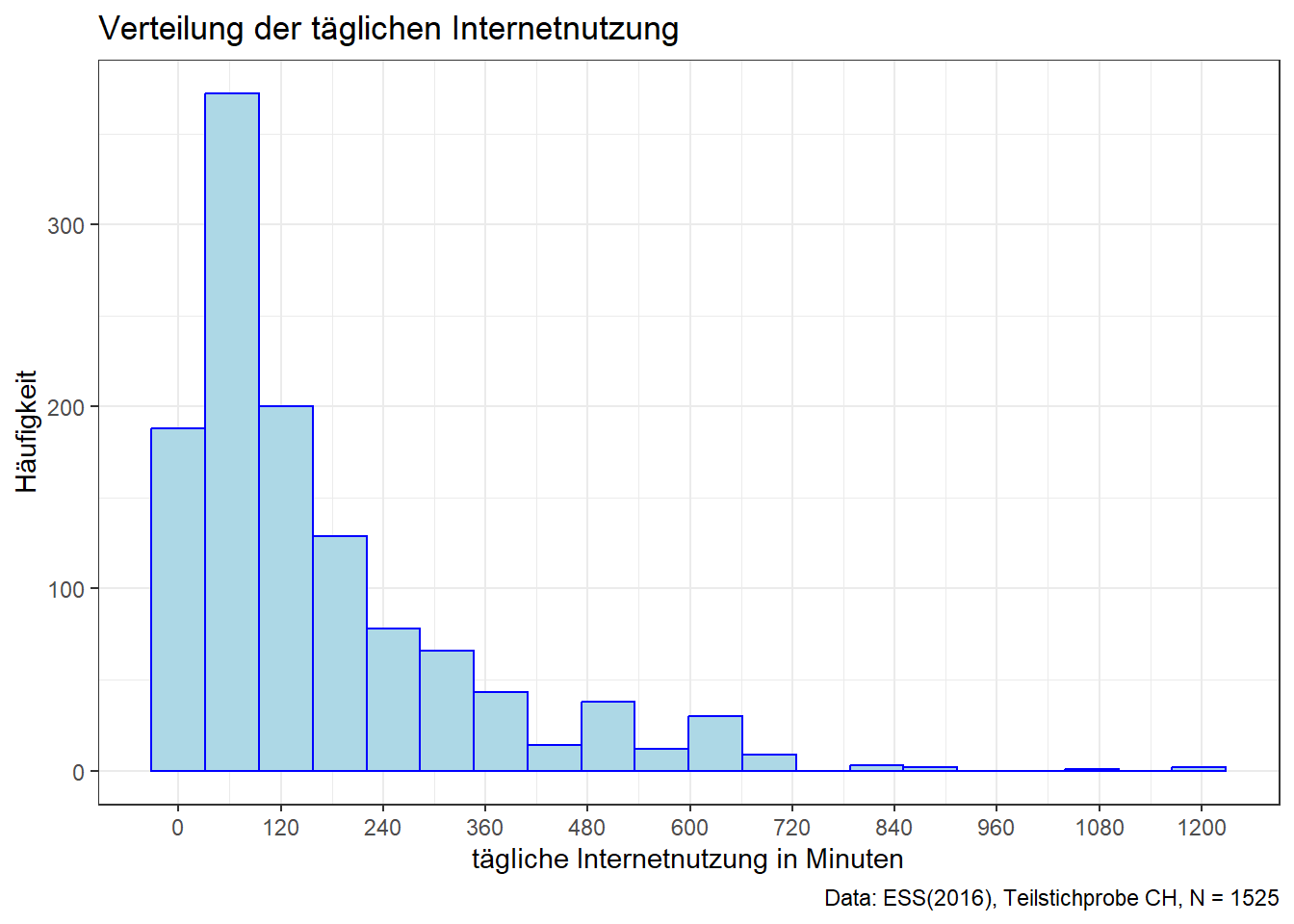 Im Durchschnitt haben SchweizerInnen in der Stichprobe ein Alter von 47.83 Jahren mit einer Standardabweichung von 18.78 Jahren, eine Klimaverantwortung von 6.86 mit einer Standardabweichung von 2.24, eine Ausbildung von 11.30 Jahren mit einer Standardabweichung von 3.50 Jahren und verbringen an einem Tag durchschnittlich 163.60 Minuten (ca. 2.7 Stunden) im Internet mit einer nahezu gleich grossen Standardabweichung von 163.20 Minuten.