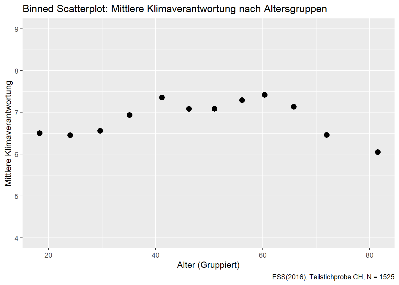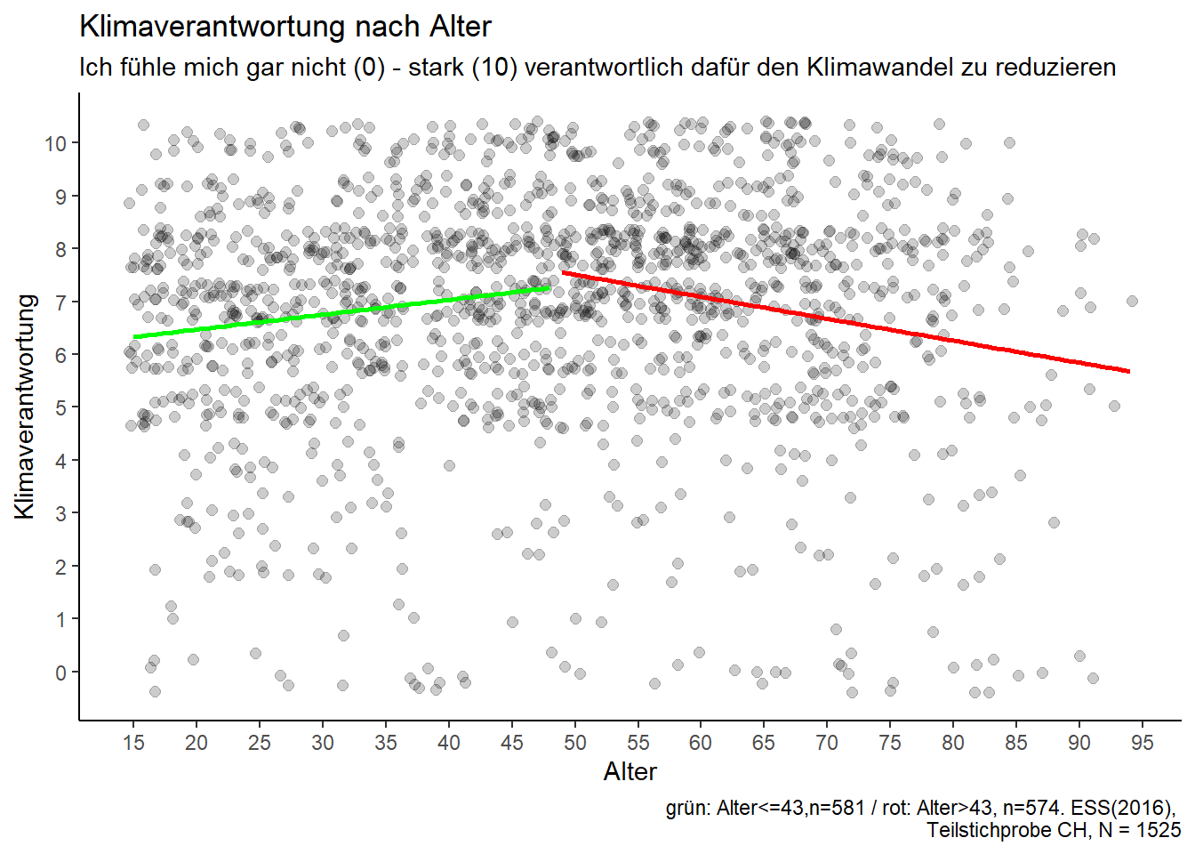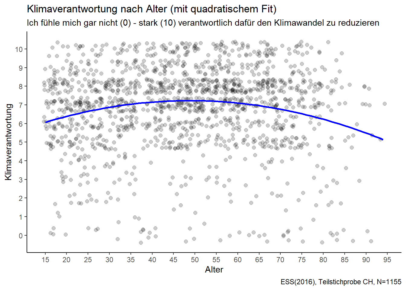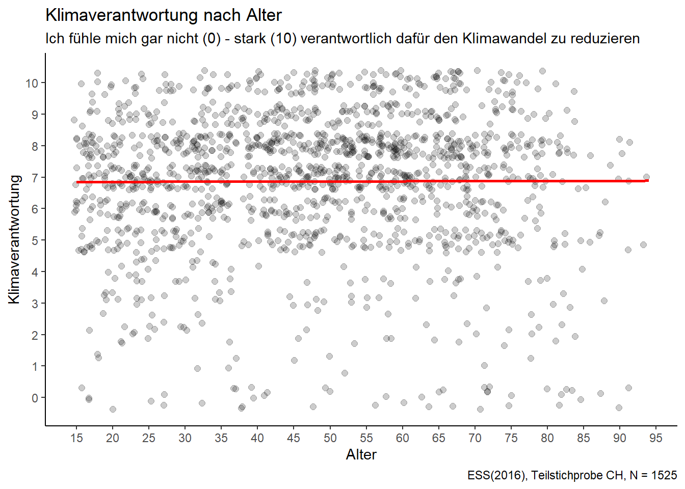 Im Folgenden beschäftigen wir uns mit dem Zusammenhang zwischen dem Lebensalter und der Klimaverantwortung in der schweizer Bevölkerung. Wir fragen uns, welche Form dieser Zusammenhang hat.