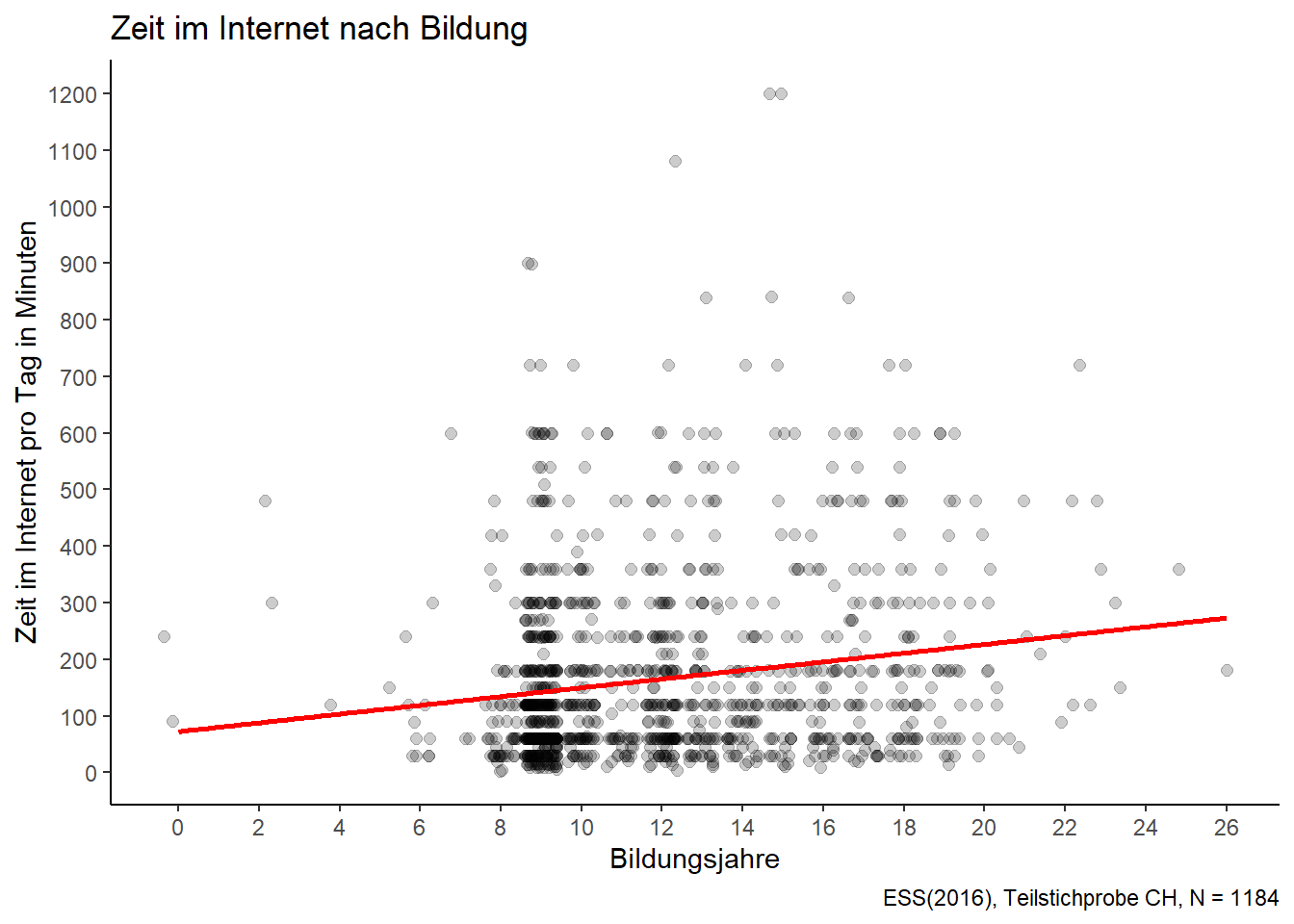 Zwischen 10 und 20 Jahren sind einige relativ hohe Werte für Internetnutzung zu erkennen. Bei diesen könnte es sich möglicherweise um Ausreisser handeln, welche die Robustheit bzw. Stabilität von Regressionsergebnissen einschränken und über relevante Sachverhalte in den Daten hinwegtäuschen könnten.