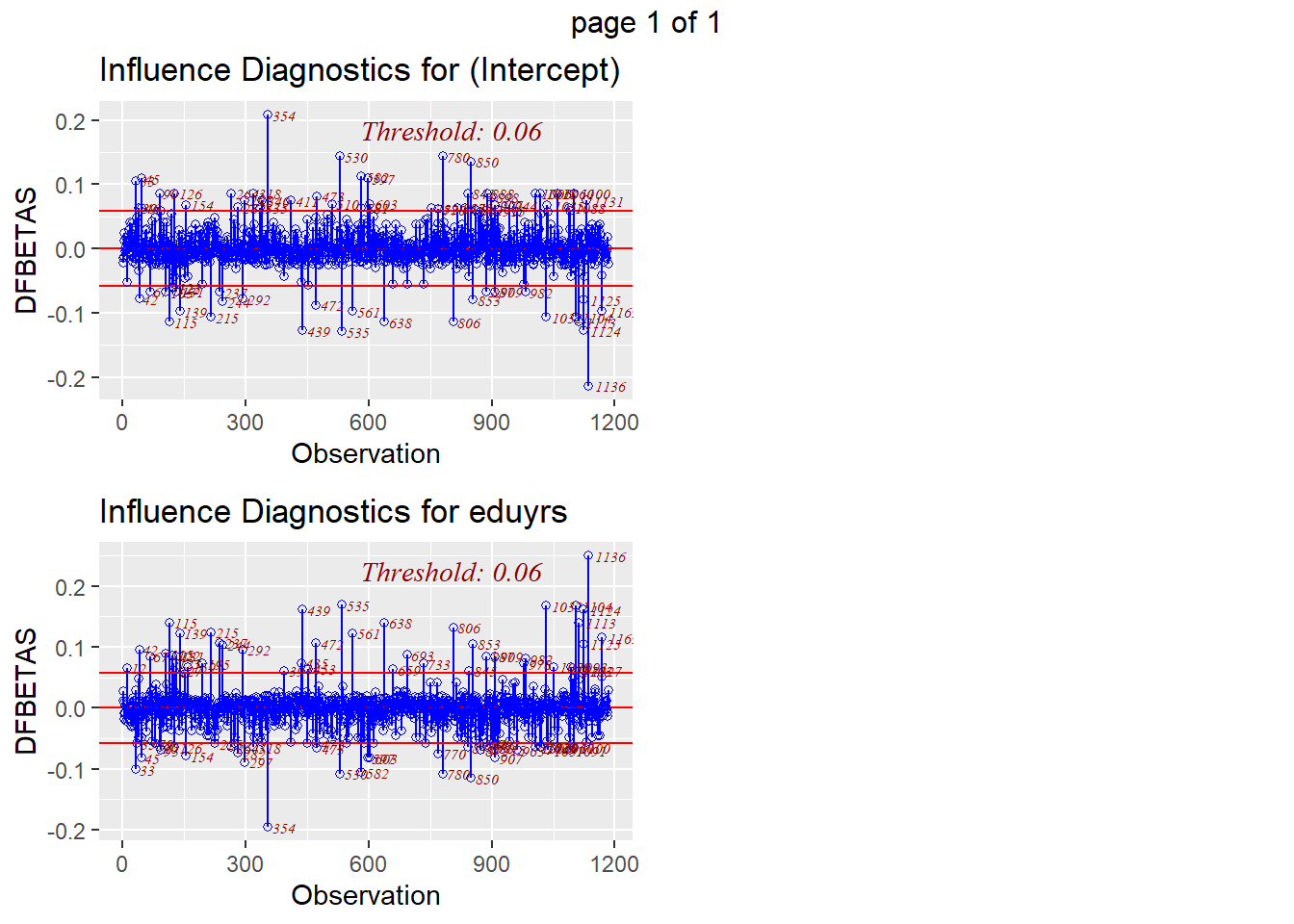 Mit folgendem Befehl ergänzen wir unseren Teildatensatz um eine neue Variable, welche allen Merkmalsträgern mit gültigen Werten das standardisierte Einflussmass dfbetas zuweist: