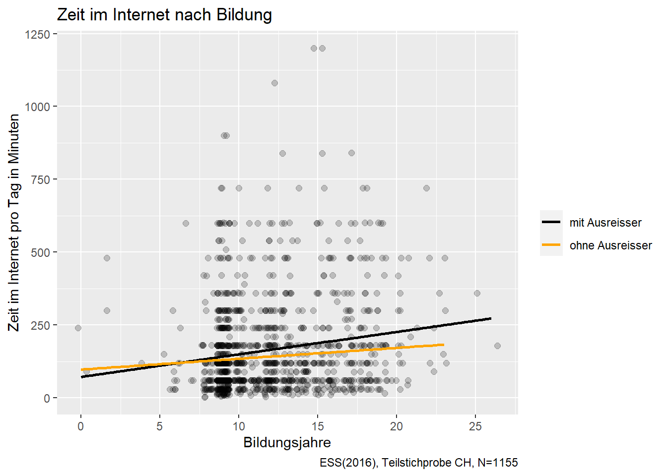 Schauen wir uns die Robustheit zusätzlich aus statistischer Perspektive an: Der p-Wert indiziert in den Ausgangsergebnissen sowie auch unter Ausschluss der Ausreissern, dass es einen signifikanten Zusammenhang zwischen den Bildungsjahren und der täglichen Internetnutzung gibt. Anders als aus inhaltlicher Perspektive ist das Ergebnis aus statistischer Perspektive also robust gegenüber einem Ausreisserausschluss.