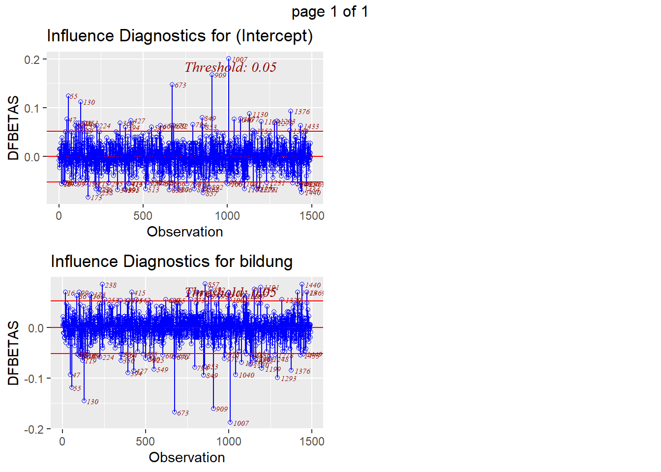 Der Grenzwert beträgt 0.05. Das heisst alle dfbetas zwischen -0.05 und 0.05 sind für uns als Ausreisser zu betrachten.
