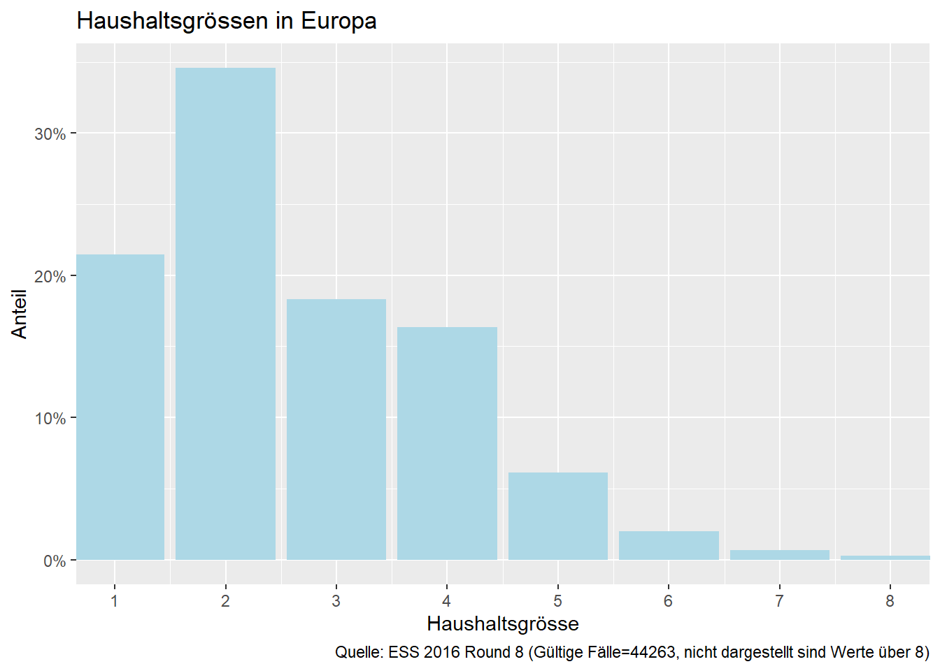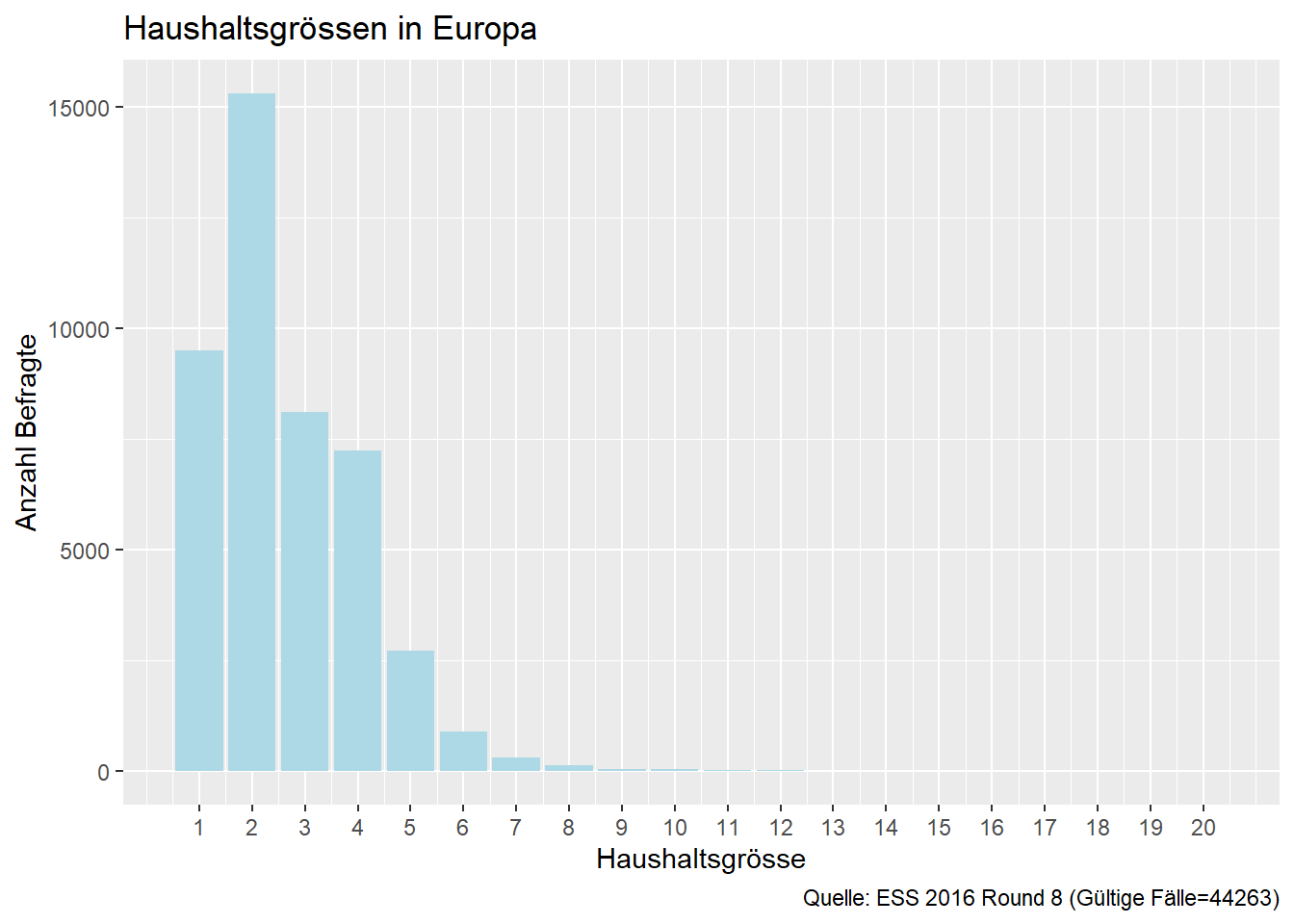 Eine relative Mehrheit von etwa 15’000 der Befragten im ESS-Datensatz, das sind etwa 35%, lebt in einem 2-Personen-Haushalt, gefolgt von 1-Personen-Haushalten, 3- und 4- Personen-Haushalten. In diesen 4 Haushaltstypen leben etwa 90% der Befragten. Eine kleine Gruppe verteilt sich absteigend auf die Kategorien der 5-, 6- und 7-Personen-Haushalte. Nur sehr wenige Befragte leben in noch grösseren Haushalten.