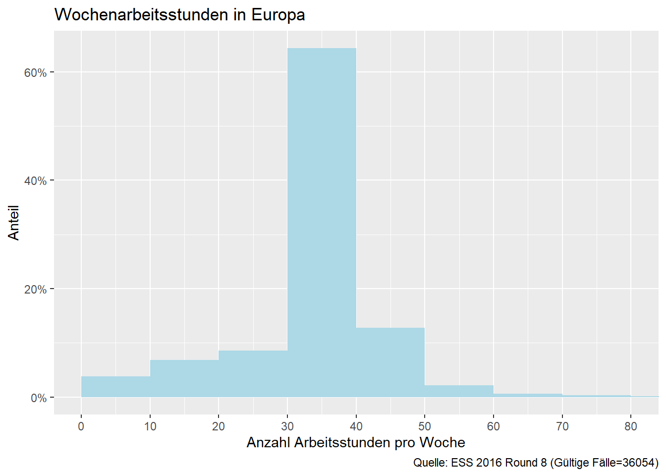 labs(x = "Anzahl Arbeitsstunden pro Woche", y = "Anteil", title = "Wochenarbeitsstunden in Europa", caption = "Quelle: ESS 2016 Round 8 (Gültige Fälle=36054)") +