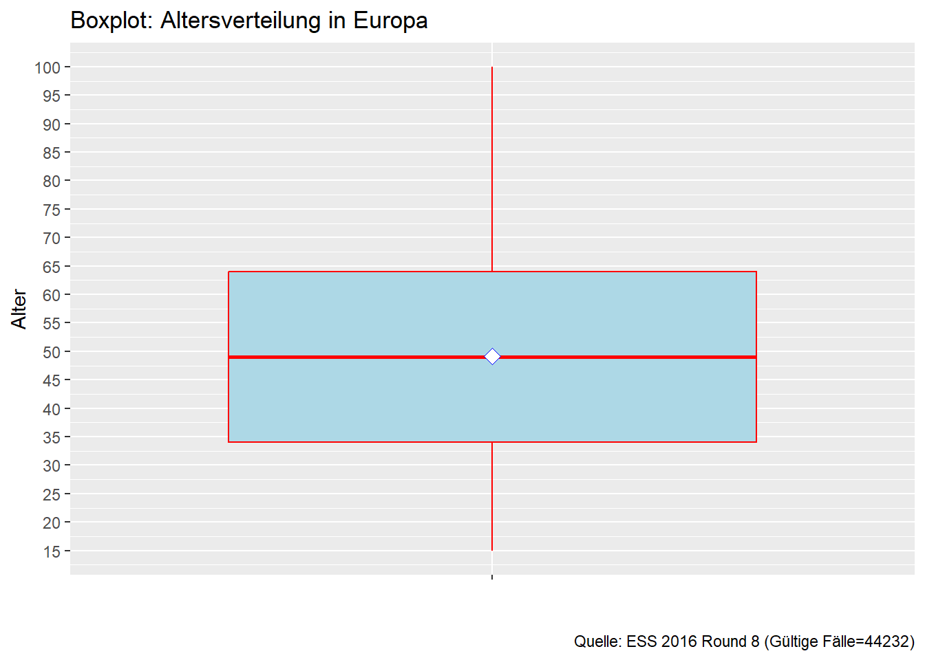 Die mittleren 50% des Altersrankings sind zwischen 34 (1. Quartil) und 64 (3.Quartil) Jahre alt. Der Kern der Altersverteilung, bzw. der Interquartilsrange, ist somit 30 Jahre breit. Die Person in der Mitte des Altersrankings ist 49 Jahre alt - ihre Abstände zum 1. und 3. Quartil sind folglich etwa gleich (Achtung: Dies ist nicht immer so - nur dann, wenn die Belegungen unter- und oberhalb des Medians sehr ähnlich sind). Das Minimum beträgt 15 Jahre, das Maximum liegt bei 100 Jahren. Keine Werte werden als Ausreisser angezeigt, das heisst, keine Werte über- oder unterschreiten den 1.5-fachen IQR.